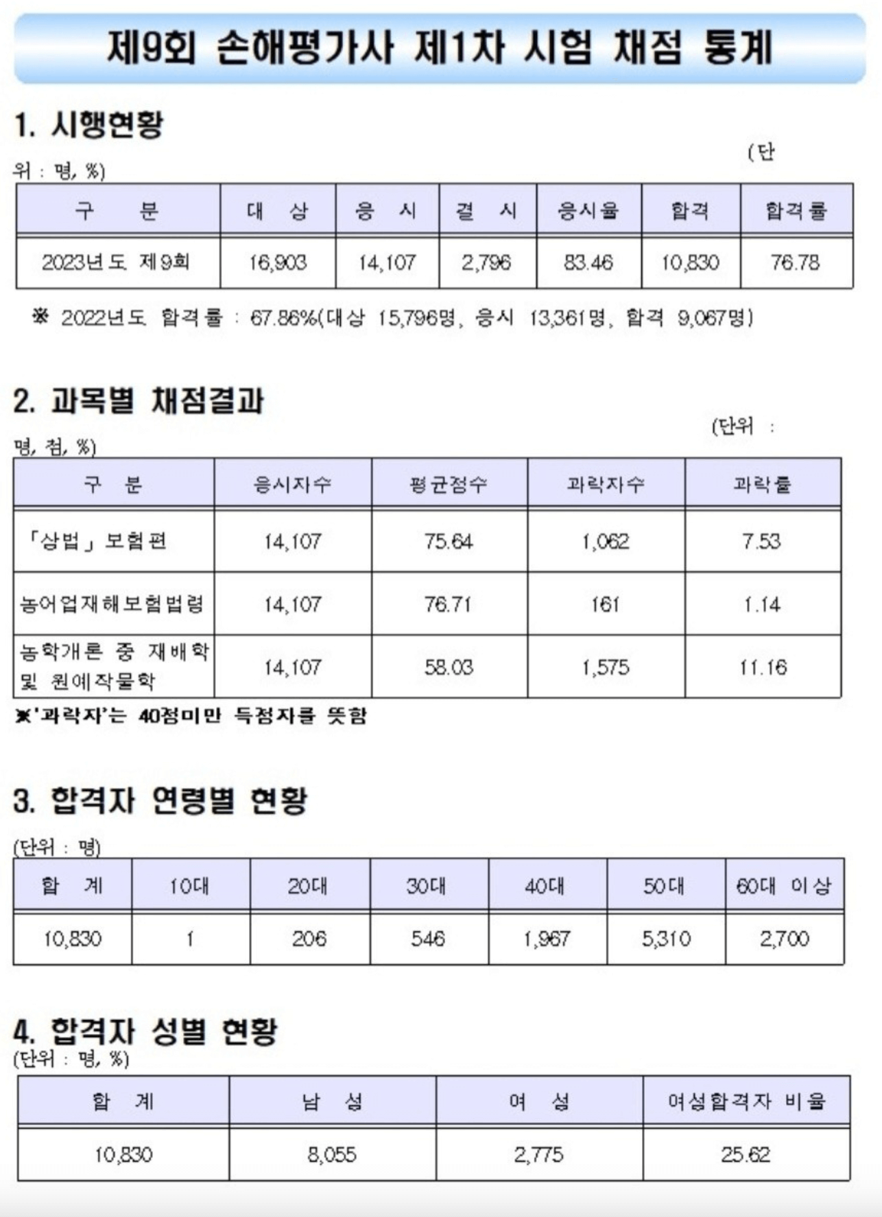 22년도 손해평가사 1차시험 합격률은 67.86%인데요. 23년도 1차시험 합격률은 무려 76.78%나 됩니다.