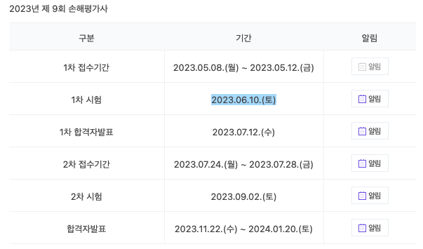 손해평가사 1차 시험은 23년 6월 10일(토요일)에 있습니다. 아래표 참고하시면 되겠습니다.